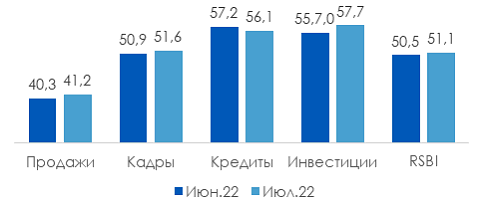 Согласно Индексу RSBI, который в июле 2022 года увеличился до 51,1 пункта, деловая активность продолжила плавный рост, в том числе за счет ощутимых изменений в компоненте инвестиций,