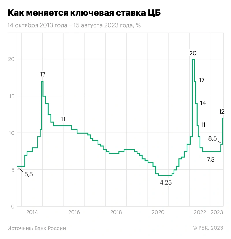Это второе подряд ужесточение политики за последний месяц. На плановом заседании в июле ЦБ поднял ставку с 7,5 до 8,5% годовых, до этого она не менялась с сентября 2022 года. В последний раз ЦБ повышал ее в феврале 2022 года — тоже внепланово — с 9,5 до 20% годовых.