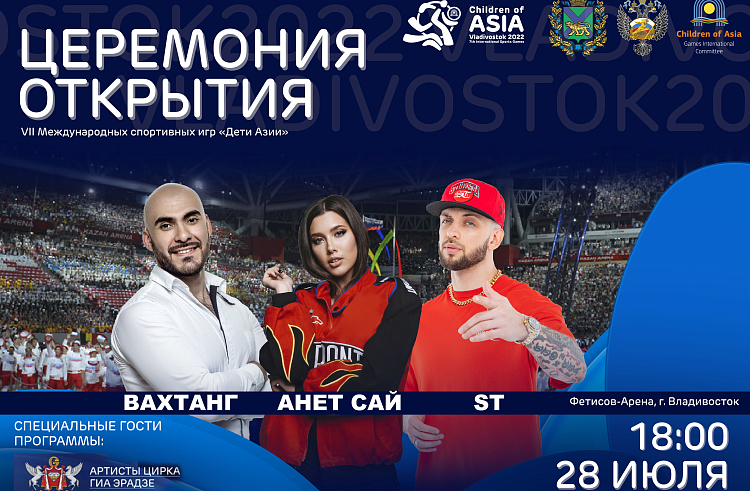 Хедлайнерами церемонии открытия станут известные молодежные артисты отечественной эстрады: Анет Сай, реппер ST, чемпион мира по битбоксу Вахтанг, артисты Королевского цирка Гии Эрадзе, а также творческие коллективы Приморского края.