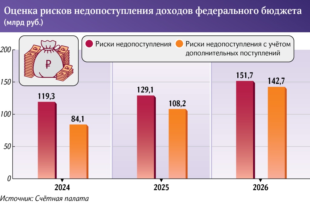 Счетная палата (СП) выявила риски недопоступления прогнозируемых доходов в федеральный бюджет. Как отмечается в документе, общая сумма недостачи может достичь 119,3 млрд рублей в 2024 году, 129 млрд — в 2025-м и 151,7 млрд — в 2026-м, то есть всего 400 млрд. При этом аудиторы проводили оценку с учетом дополнительных доходов. Эти неучтенные в прогнозе поступления составят 65 млрд рублей за три года: 35,2 млрд, 20,9 млрд и 8,9 млрд рублей соответственно.