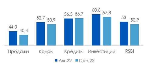 Наибольшее влияние на Индекс RSBI оказала компонента кредитов, которая продемонстрировала некоторое увеличение, и компонента инвестиций, которая хоть и снизились, но сохранила максимальные значения в зоне роста. Компонента продаж упала более чем на четыре пункта и приблизилась к показателям начала лета, компонента кадров также оказалась ниже значений предыдущего месяца.