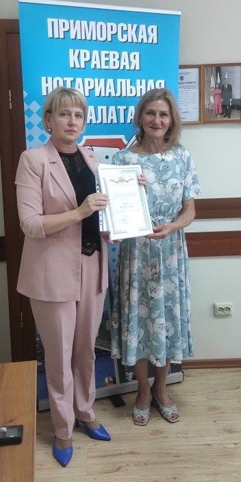 В рамках мероприятия Елена Анатольевна вручила нотариусу Владивостокского нотариального округа Приморского края Будаевой Вере Степановне Благодарность Министерства юстиции Российской Федерации за содействие в решении задач, возложенных на Минюст России.
