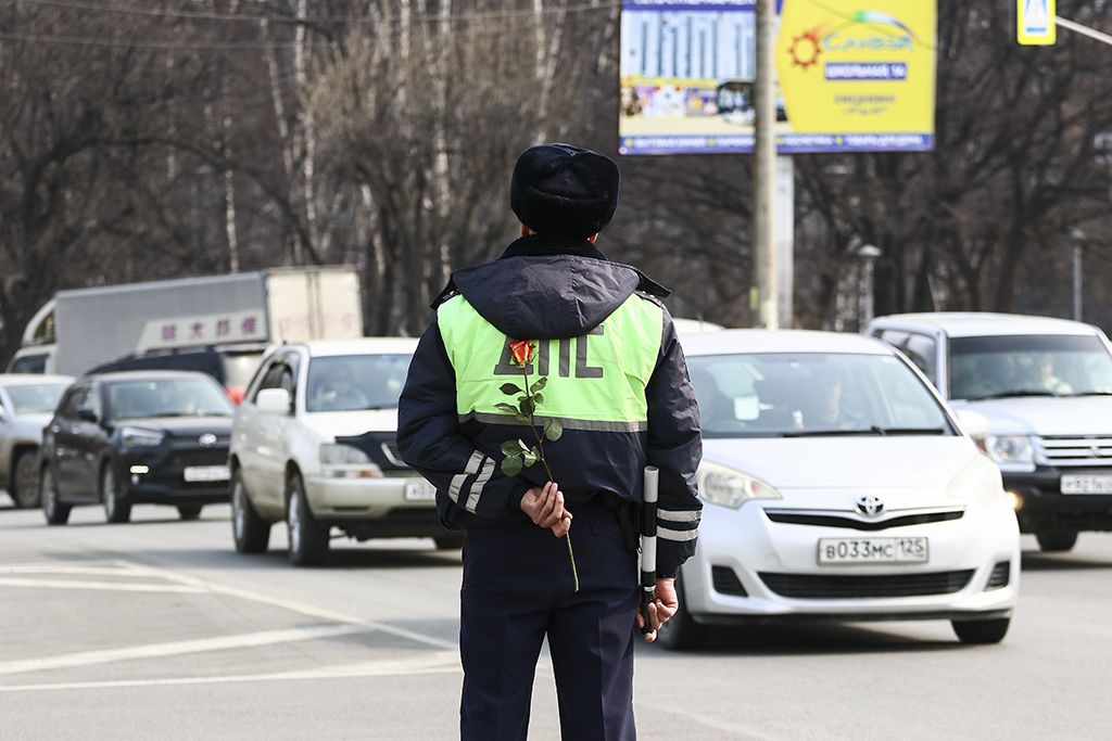 Цветы и комплименты! Находкинские полицейские поздравили автоледи с наступающим 8 марта
