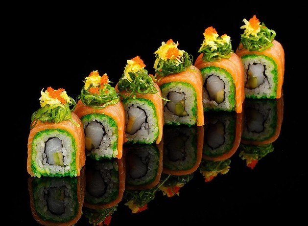 — «Ролл Ясухито»: урамаки с маринованным палтусом, фарерским лососем, масленистый авокадо, украшается шапкой из хияше вакаме и цедрой лимона.