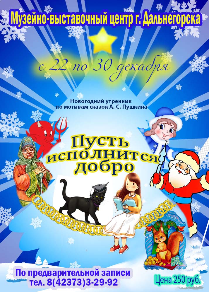 С 22 декабря по 30 декабря, музей проводит Новогодний утренник по мотивам сказок А. С. Пушкина « Пусть исполнится добро».