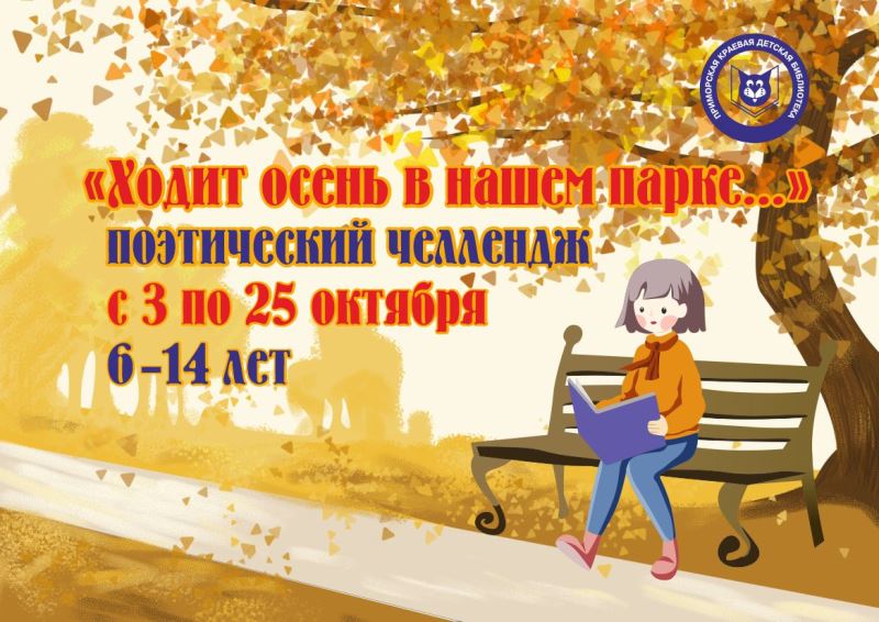 Вы заметили, что в Приморье пришла золотая осень? А помните, что сегодня, 3 октября, день рождения замечательного поэта Сергея Есенина? Может быть, вы догадались, какое решение приняли специалисты Приморской краевой детской библиотеки в этот замечательный день? Объявить о новом поэтическом челлендже «Ходит осень в нашем парке». Он пройдёт с 3 по 25 октября для читателей от 6 до 14 лет.