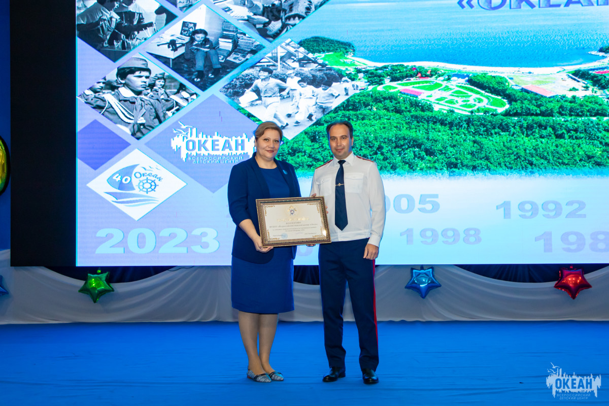 Затем на сцену вышел руководитель следственного управления Следственного комитета Российской Федерации по Приморскому краю, генерал-майор юстиции Владимир Фомин. Владимир Владимирович наградил коллектив ВДЦ «Океан» почётной грамотой от имени Председателя Следственного комитета Российской Федерации генерала юстиции Александра Бастрыкина, а также вручил благодарности за содействие в решении возложенных на Следственный комитет Российской Федерации задач:
