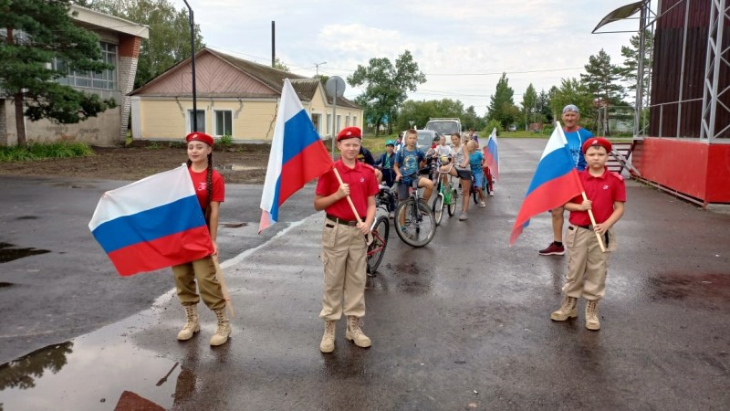 В велопробеге участвовали волонтеры Победы, воспитанники ДЮСШ «Патриот», участники всероссийского детско-юношеского военно-патриотического общественного движения Юнармия. По центральной площади района ребята пронесли главный атрибут этого дня - триколор.