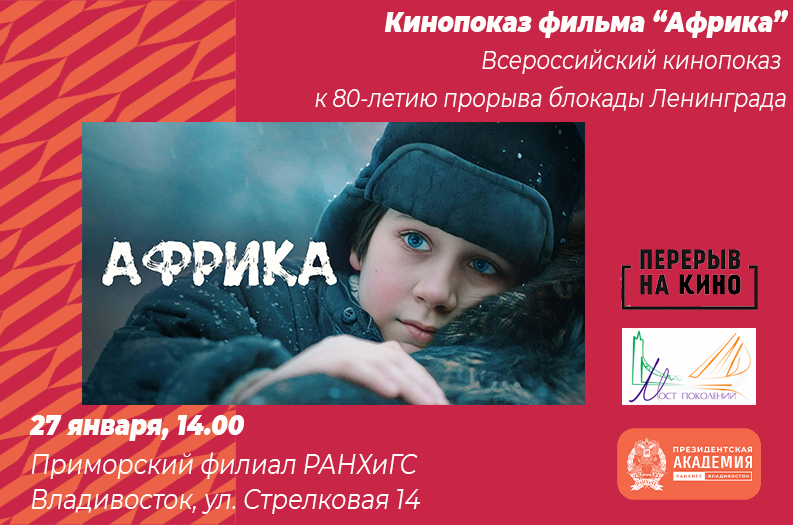 Фонд «Мост поколений» в рамках программы IX молодёжного кинофестиваля «Перерыв на кино» организует к 80-летию прорыва блокады Ленинграда всероссийский молодёжный показ фильма «Африка» (реж.