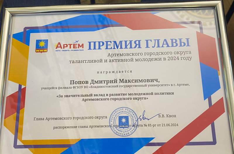 Активисты Корпуса волонтеров ВВГУ в г. Артеме Дарья Якименко, Никита Павлюк и Дмитрий Попов стали Лауреатами премии главы «За значительный вклад в развитие молодежной политики Артемовского городского округа».