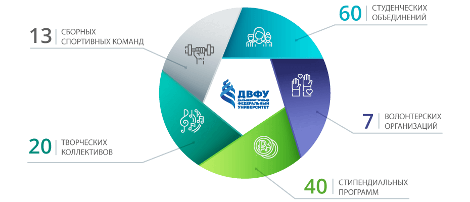В ДВФУ насчитывается семь направлений волонтерства: корпус «Просвещение», Центр подготовки волонтеров, студенческий спортивный клуб «Русские лисы», Кооперация интеграции и творчества студентов с ОВЗ (КИТ), организация «Волонтеры-медики», волонтеры-допсихологи из команды «НеНервы» и активисты Центра развития добровольчества. Всего в волонтерской деятельности задействовано более 450 студентов.