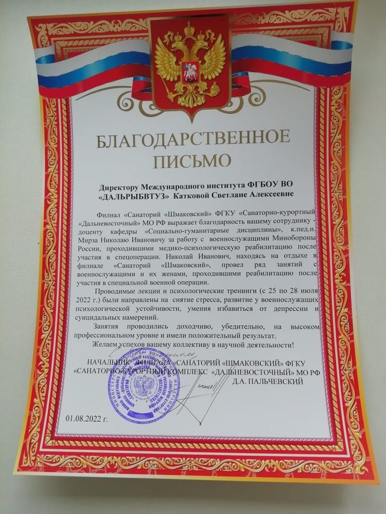 Руководство филиала «Санаторий «Шмаковский» ФГКУ «Санаторно-курортный комплекс «Дальневосточный» МО РФ отметило профессионализм, с которым Николай Иванович провёл мероприятие и направило в адрес директора Международного института Дальрыбвтуза Светланы Катковой благодарственное письмо.