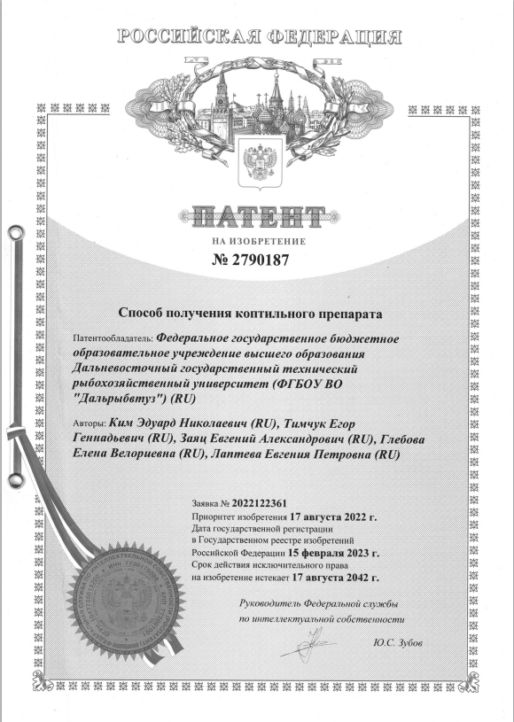 На днях Дальрыбвтуз получил очередной патент на изобретение – его регистрация в государственном реестре датирована 15.02.2023 года. Изобретение касается способа получения коптильного препарата. Это коллективная разработка учёных института пищевых производств Дальрыбвтуза, в которой принимали участие директор института, к.т.н. Евгения Лаптева, заведующий кафедрой "Управление техническими системами", д.т.н. Эдуард Ким , доценты этой же кафедры, к.т.н. Егор Тимчук и Елена Глебова , а также аспирант Евгений Заяц .