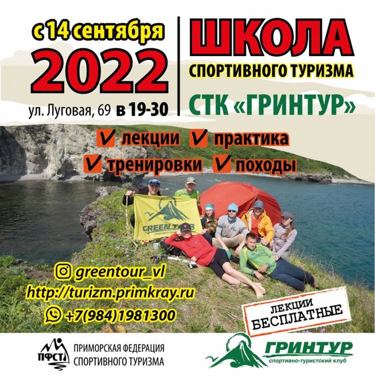 Спортивно-туристский клуб «Гринтур» приглашает всех желающих в школу туризма во Владивостоке. Взрослая секция начинает работу 14 сентября, детская – 16 сентября. Стартовала запись на платформе https://orgeo.ru/event/23483 .