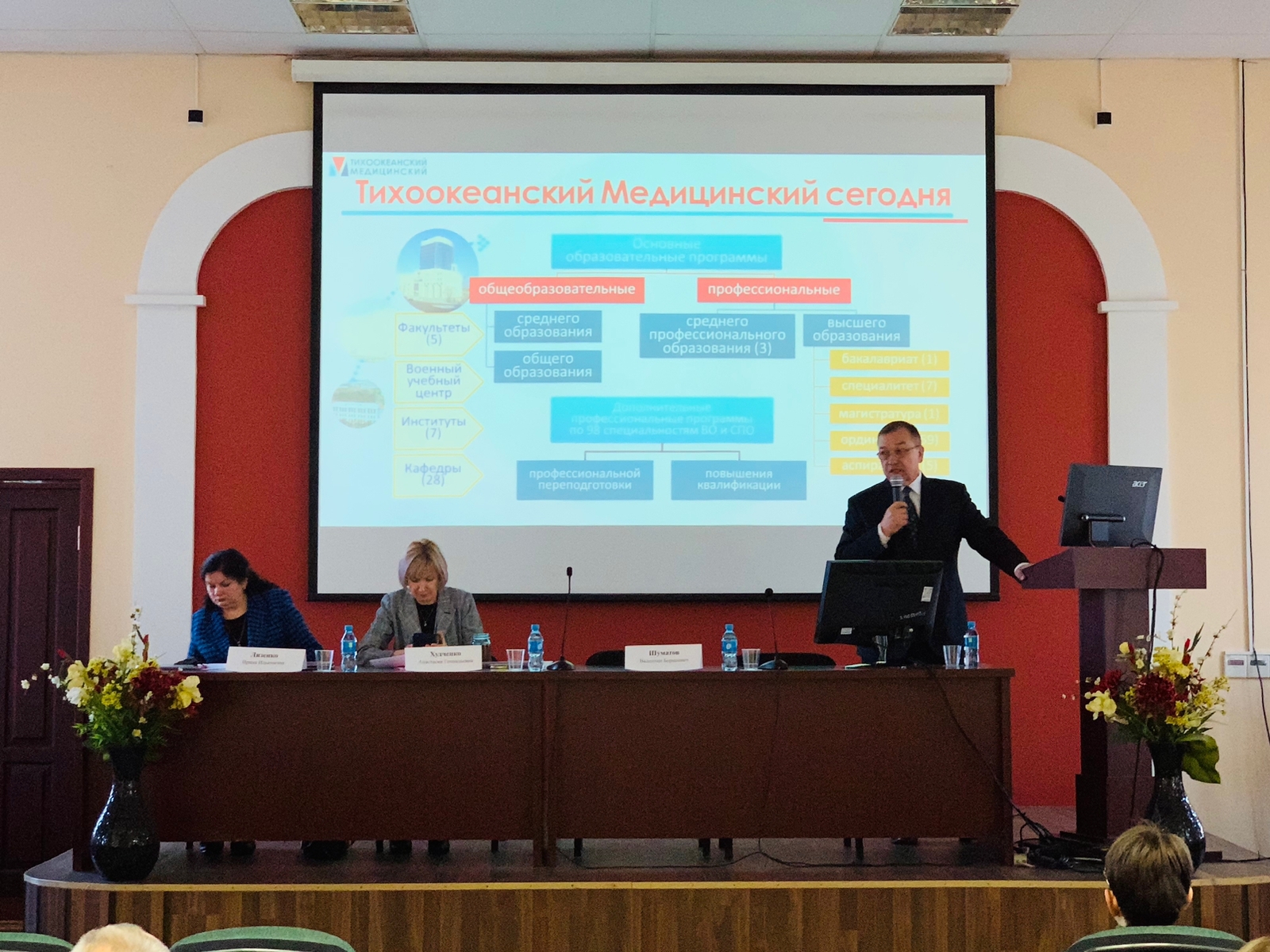 Ректор Тихоокеанского Медицинского Валентин Борисович Шуматов представил медицинскому сообществу новую концепцию развития вуза в рамках реализации программы «Приоритет -2030» и отметил, что университет ждут глобальные изменения, как в образовательном процессе, так и в плане реализации кадровой политики.
