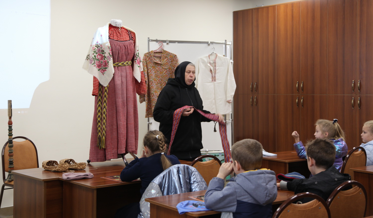 Собравшимся была представлена небольшая экспозиция элементов русской национальной одежды: сарафан, мужская рубаха, платок, пояс, лапти, с которой познакомила ребят инокиня Мария (Воробьева).
