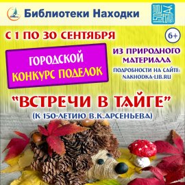 Библиотеки Находки приглашают ребят до 12 лет принять участие в городском конкурсе поделок из природного материала «Встречи в тайге». Конкурс приурочен к 150-летию со дня рождения великого путешественника, писателя и исследователя Владимира Клавдиевича Арсеньева.