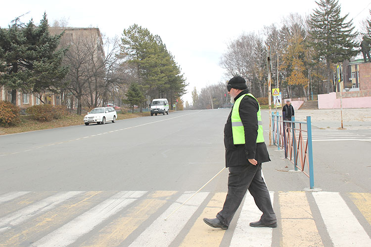 Надеваю на глаза светонепроницаемые очки, а поверх пальто — жилет и беру в руки белую трость. Первая реакция – паника. Совершенно не могу понять куда идти. Слышу только резкие и разнообразные звуки города, шелест шин проносящихся где-то рядом автомобилей и размеренный разговор моих попутчиков. Видя, что я застыл на месте, они вежливым толчком направляют меня в сторону «зебры» — пешеходного перехода напротив многоквартирного дома на Ленинской, 31.