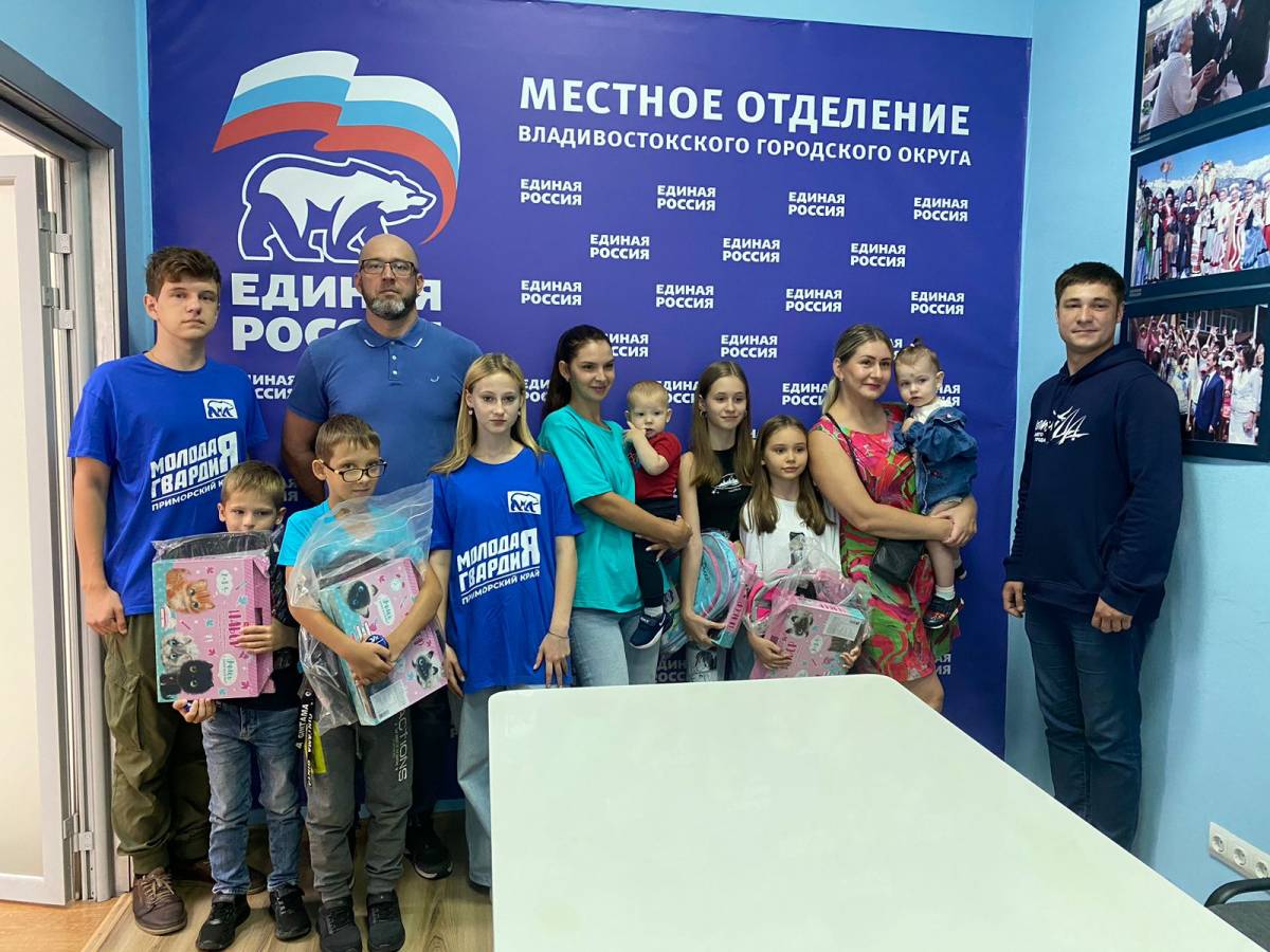 В городском отделении партии «Единая Россия» в рамках Всероссийской акции «Собери ребенка в школу» руководитель фракции «Единая Россия» в Думе Владивостока Евгений Недбай вручил многодетным семьям школьные рюкзаки и «наборы первоклассников».
