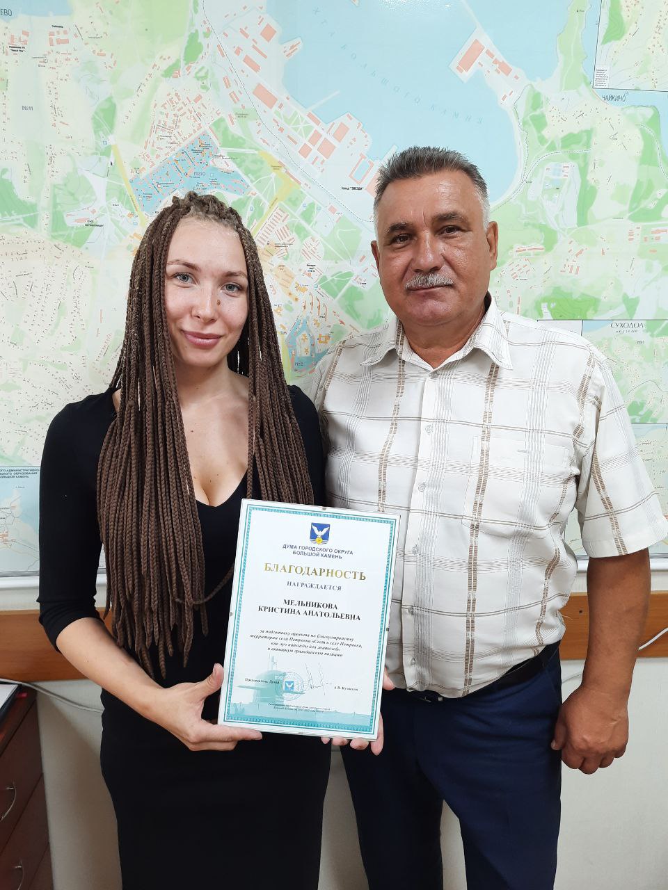 Владимир Коваленко, депутат Думы городского округа Большой Камень, вручил Благодарность Думы Кристине Мельниковой за подготовку проекта "Свет в селе Петровка, как луч надежды для жителей".