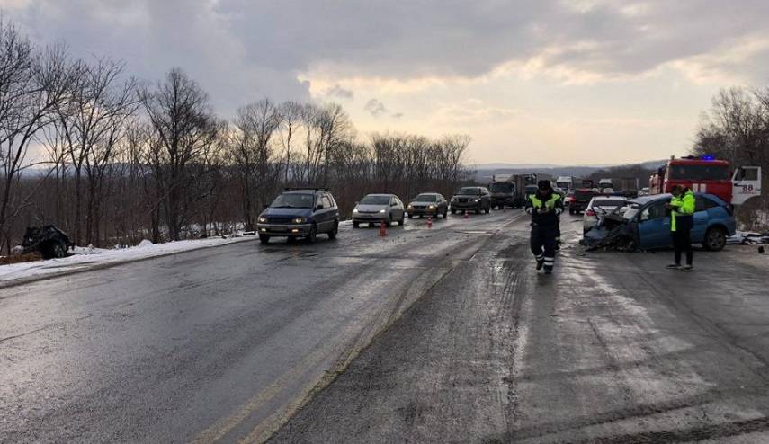 Полицейскими предварительно установлено, что 43-летний водитель автомашины Toyota Nadia, двигаясь со стороны Владивостока в направлении Уссурийска, не справился с управлением, выехал на полосу дороги, предназначенную для встречного движения, где совершил лобовое столкновение с автомобилем Toyota Camry.