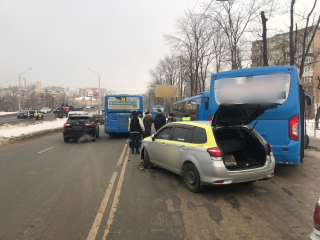 Госавтоинспекция Владивостока устанавливает обстоятельства ДТП с участием автобусов и такси в районе остановки «Парк Победы»,