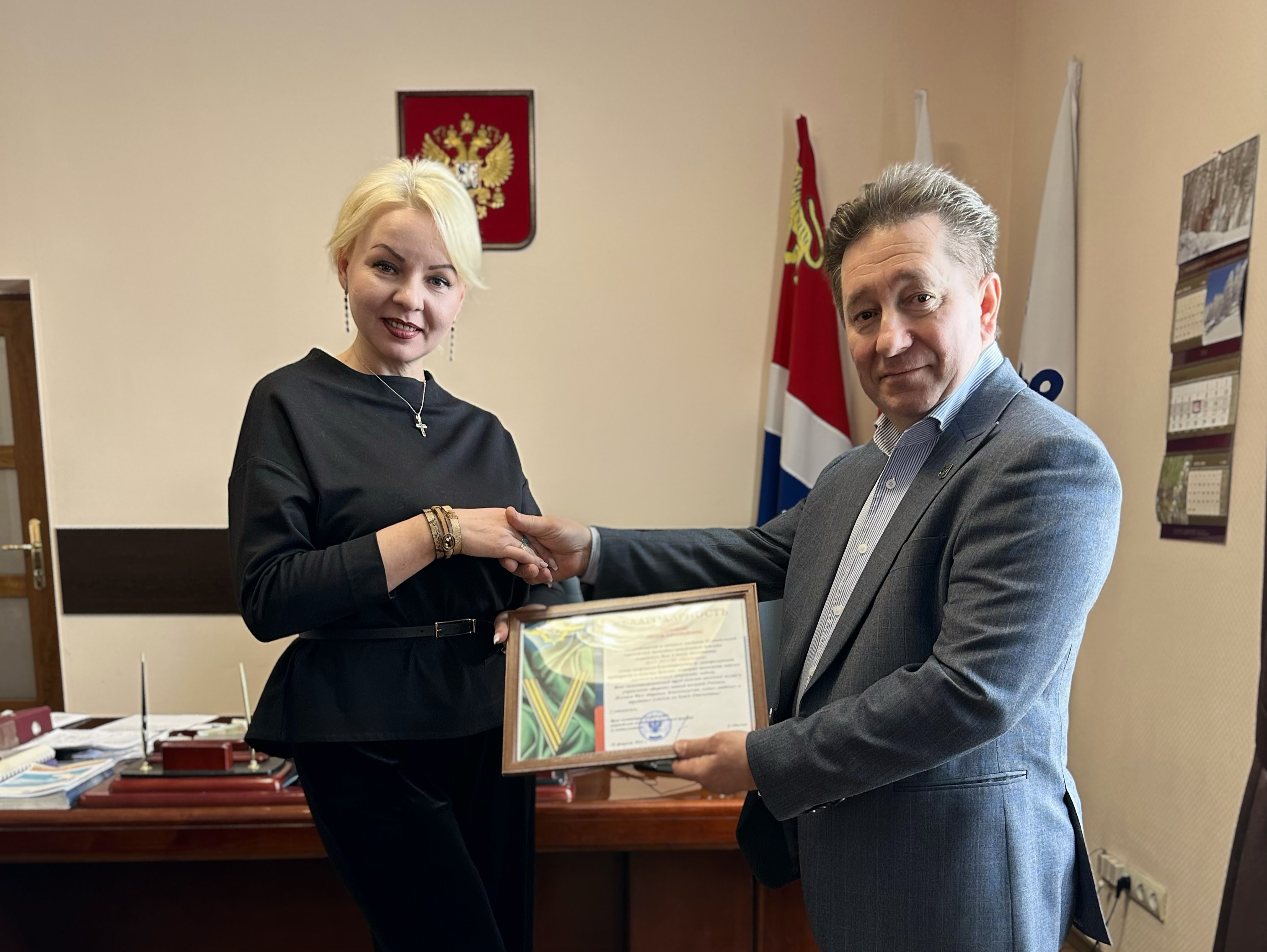 Сегодня первый заместитель председателя Думы Находкинского городского округа Олег Серганов от имени командования и личного состава 83 отдельной гвардейской десантно-штурмовой бригады вручил Благодарность директору МАУ ДО СШ «Приморец» Оксане Володиной за поддержку и помощь бригаде, а также за вклад в укрепление обороны России.