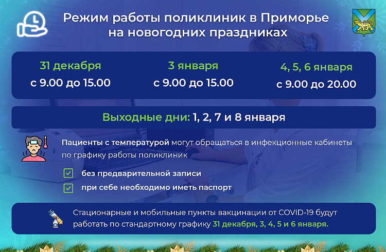 В новогодние праздники медицинские учреждения Приморского края будут функционировать в измененном режиме. Для поликлиник и пунктов вакцинации установлены особые графики работы на период с 31 декабря по 8 января.