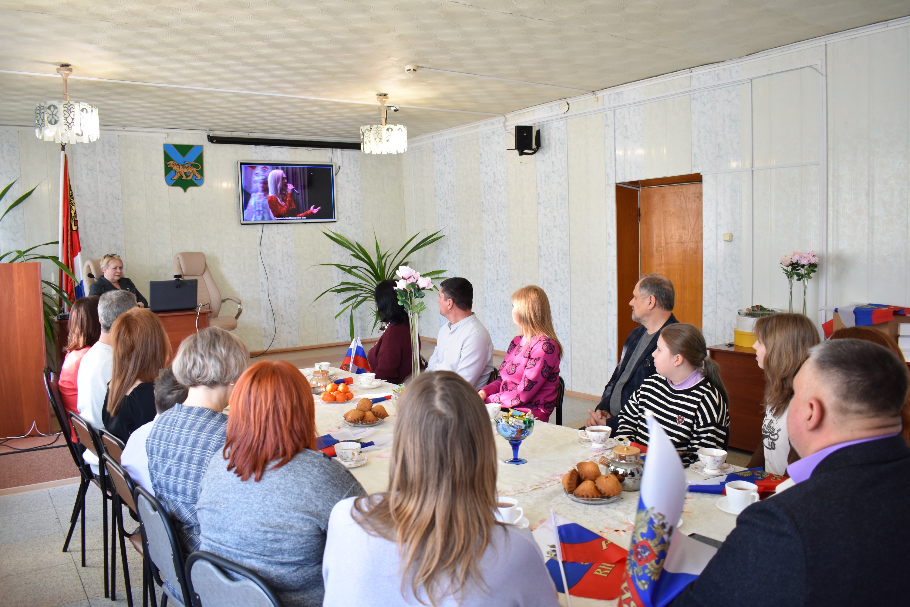 В зале заседания администрации муниципалитета за чашкой чая собрались дружные семьи, которые смогли выделить несколько часов свободного времени в плотном рабочем графике. Участники телемоста делились собственными семейными традициями, рассказывали интересные истории из жизни своей ячейки общества. Родители и их дети с удовольствием наблюдали за торжественной церемонией открытия Года на большом экране.