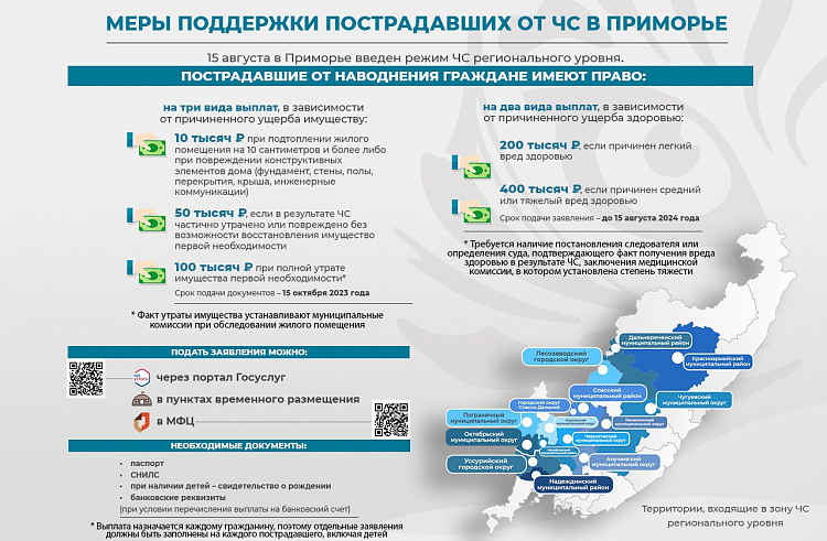 Напомним, с 15 августа в Приморье в результате беспрецедентного количества выпавших осадков введен режим ЧС регионального уровня, с 25 августа – режим ЧС федерального уровня. Оба режима предполагают возможность получения пострадавшими различных выплат. Так, из регионального бюджета предоставляется выплата в 10, 50 или 100 тысяч рублей за ущерб имуществу и выплата в 200 или 400 тысяч рублей за ущерб здоровью. Федеральное финансирование дает возможность получить выплаты на капремонт и компенсацию по утрате жилья.