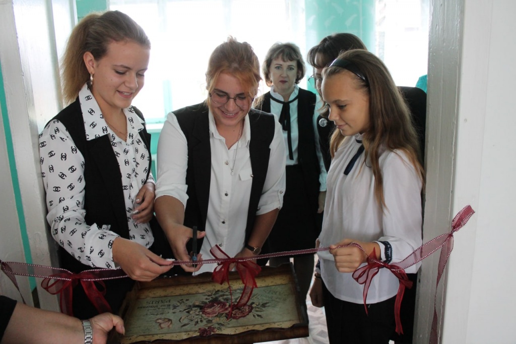 Честь разрезать церемониальную ленту и первыми войти в класс была предоставлена ученицам этой школы.