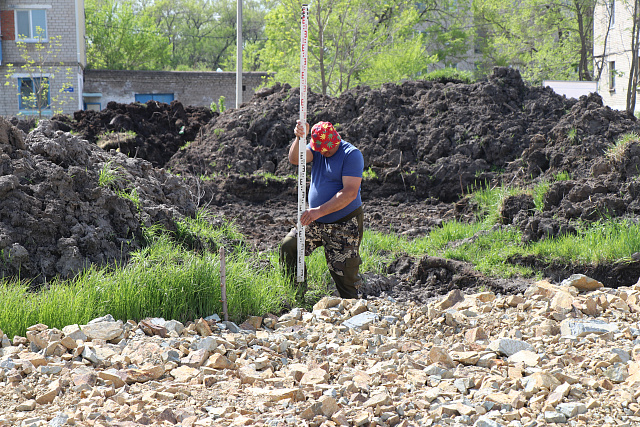 На объекте задействованы: экскаватор, погрузчик и четыре грузовика. Этап по вертикальной планировке земельного грунта выполнен на 80 %.