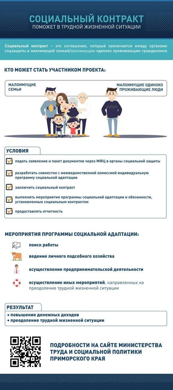 По вопросам о порядке назначения и выплаты государственной социальной помощи на основании социального контракта необходимо обращаться в отделение по Арсеньевскому городскому округу КГКУ «Центр социальной поддержки населения Приморского края» тел. 8(42361)3-44-8, в МФЦ или воспользоваться порталом Госуслуги.