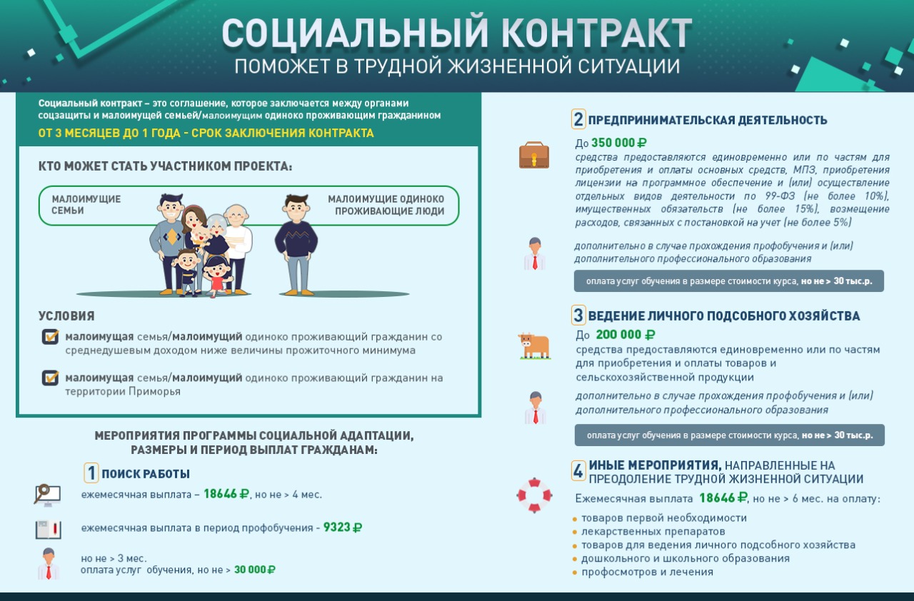 Если Ваш среднедушевой доход и/или доход Вашей семьи по не зависящим от Вас причинам ниже величины прожиточного минимума, рассчитанной с учетом основных социально-демографических групп населения в порядке, определенном Правительством Приморского края, предлагаем рассмотреть возможность получения государственной социальной помощи на основании социального контракта.