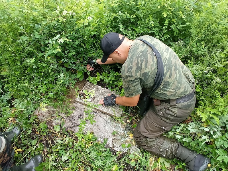 Группа поисковиков выехала для осмотра. Объект действительно похож на могилу. Здесь осталась плитка с именем, вмурованная в большое бетонное основание, но все слова на ней — нечитаемые. На плитке была установлена фотография человека, но она забита твёрдым предметом. Скорее всего, это было проявление вандализма.