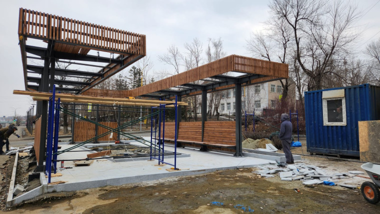Проектом предусмотрены работы по строительству навеса с лавочками, обустройство освещения и озеленение территории. В настоящее время подрядчик уже подготовил основание под покрытие и смонтировал каркас, ведется облицовка, установка скамеек и монтаж освещения. Завершить строительные работы планируется в феврале. Озеленение выполнят при благоприятных температурных условиях.