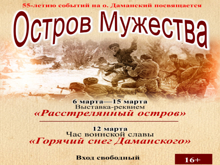 12 марта в 15:00 в Центральной городской библиотеке им. Н.К. Крупской пройдет Час воинской Славы «Горячий снег Даманского», посвящённый 55-летию событий на легендарном острове.