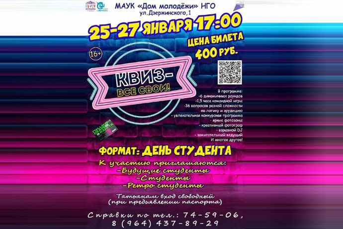 С 25 по 27 января в 17:00 для молодых и активных на площадке Муниципального Дома молодёжи пройдёт командная квиз-игра «День студента» (16+).