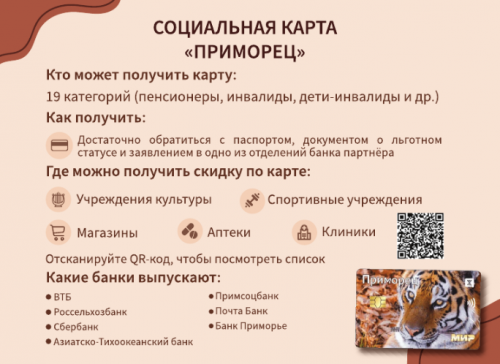 Её главная задача — улучшение качества жизни приморцев, нуждающихся в социальной поддержке. Оформить карту «Приморец» можно в МФЦ, а также в офисах банков «Примсоцбанк», «Азиатско-Тихоокеанский банк», «Почта Банк», «Сбербанк», «Приморье», «ВТБ», «Россельхозбанк». Право на это имеют пенсионеры, инвалиды, ветераны военных действий, многодетные семьи и другая льготная категория граждан.