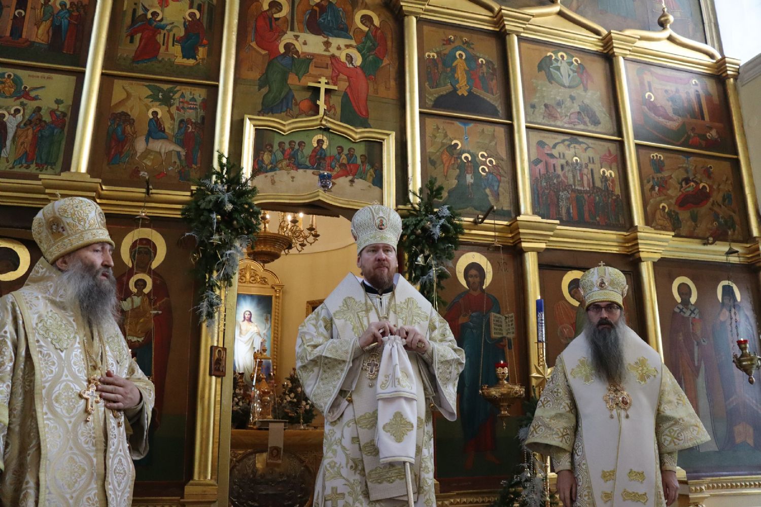 В завершение богослужения епископ Гурий поздравил митрополита Владимира с Рождеством Христовым. Благочинный Свято-Никольского собора игумен Алексий (Несмеев) от имени клира и прихожан поблагодарил за архипастырский визит и преподнес букет цветов.