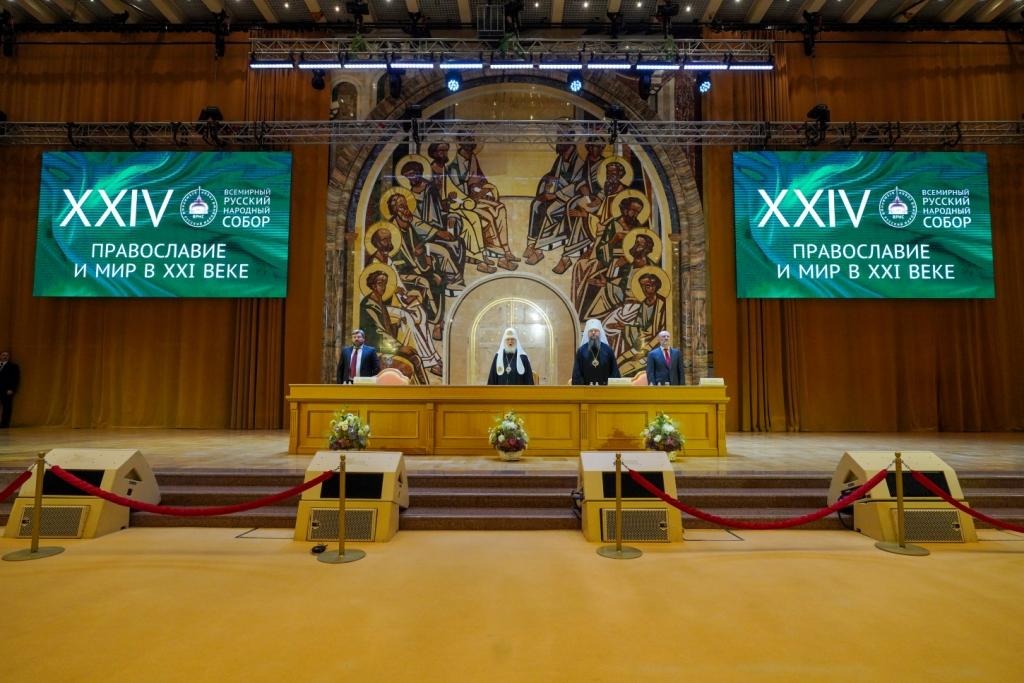 Глава ВРНС Святейший Патриарх Московский и всея Руси Кирилл объявил XXIV Всемирный русский народный собор открытым, прозвучал гимн Российской Федерации, после чего Святейший Владыка выступил с основным докладом.