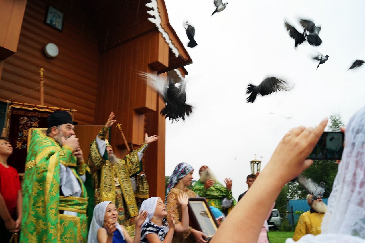 По завершении Крестного хода, остановившись на ступенях храма, владыка вдруг взял в руки голубей и стал раздавать их прихожанам. Какой восторг и неописуемую радость это вызвало у детей и взрослых!