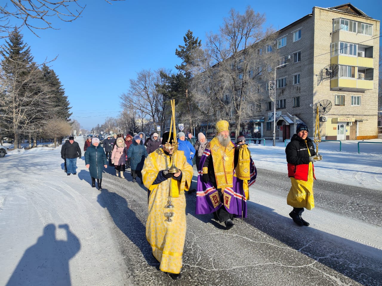 После Божественной литургии был совершен традиционный молебен с Крестным ходом вокруг центральной части города, общей протяженностью около 2 километров.