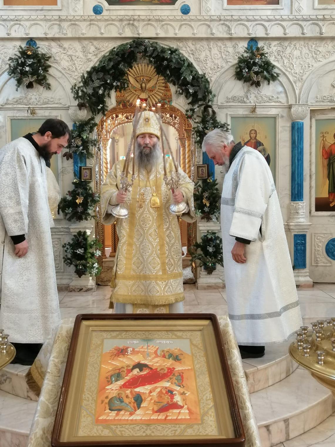 В конце богослужения правящий архиерей поздравил всех с наступающим Рождеством Христовым и рассказал о значимости данного праздника: