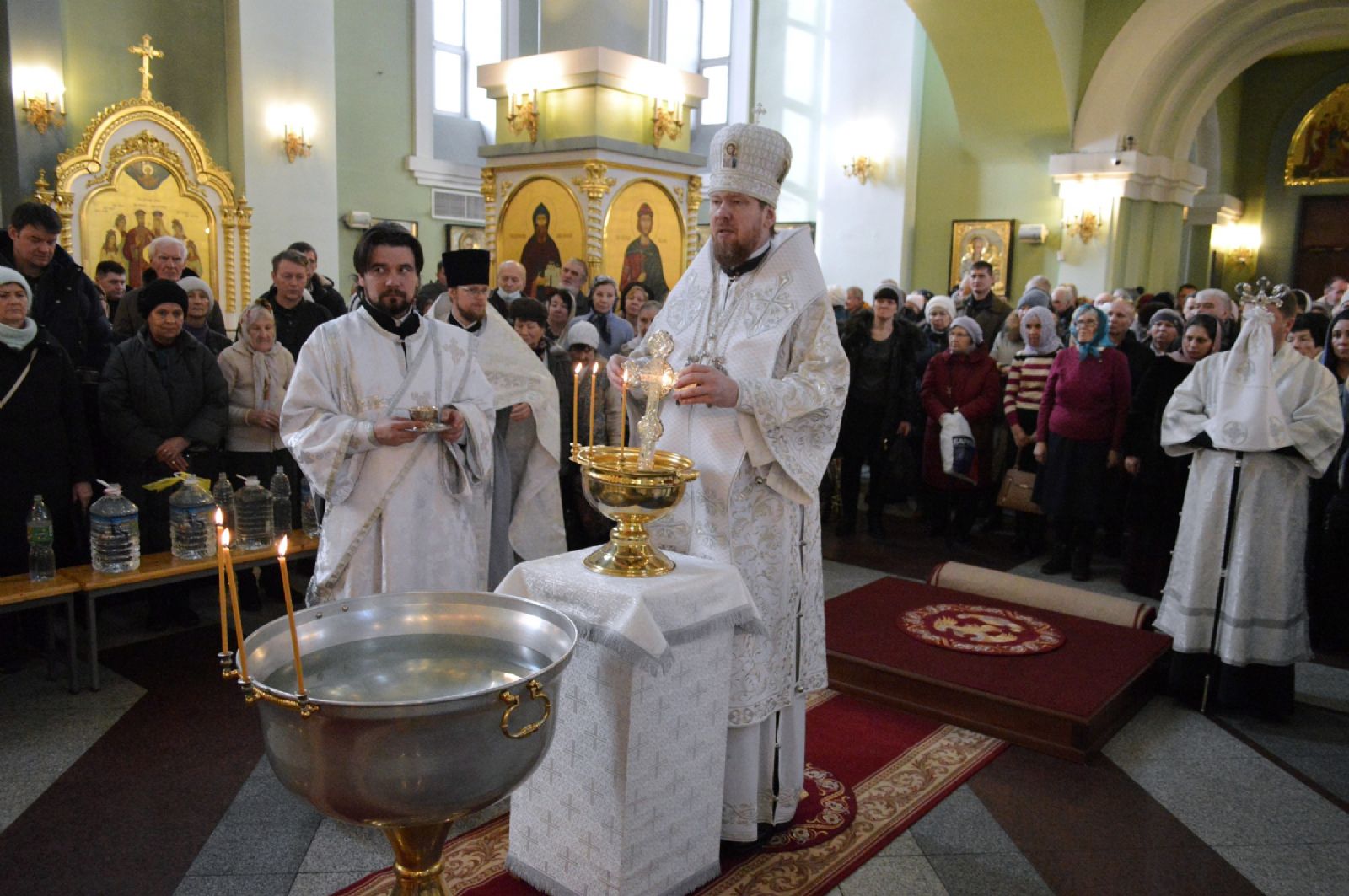 По заамвонной молитве при пении тропарей «Глас Господень на водах» священнослужители вышли в центр храма, где митрополит Владимир совершил чин великого освящения воды, после которого окропил верующих святой водой.