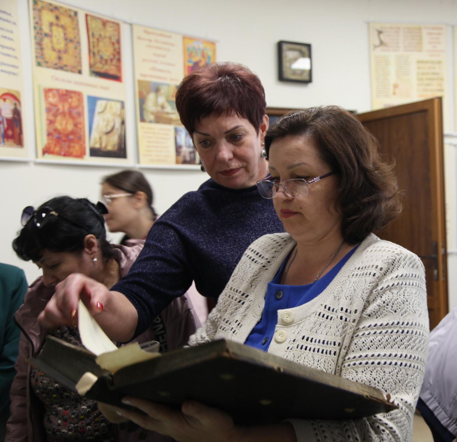 Встреча с педагогами завершилась экскурсией по Духовно-просветительскому центру, которую провела инокиня Мария (Воробьева). Гости побывали в библиотеке, Музее русской культуры, Музее церковной культуры и в зале, где расположены картины современных русских художников.