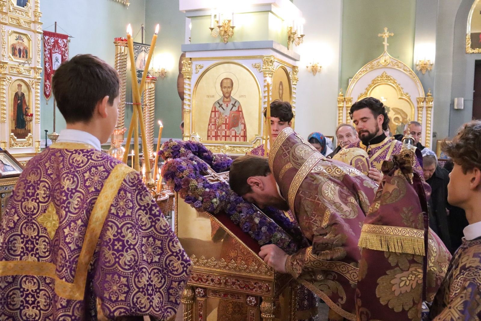 По отпусте литургии митрополит Владимир и сослужившее ему духовенство совершили славление и поклонились Кресту Господню.