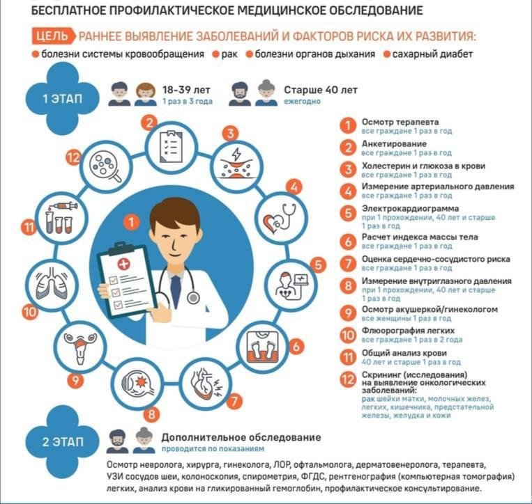 Предлагаем разобраться вместе. Если изложить простым языком, то, что написано выше – диспансеризация помогает увеличить продолжительность жизни конкретного человека, и позволяет ему оставаться здоровым и полным сил до глубокой старости. Кто-то удивится – человечество веками искало и не находило чудодейственное средство (метод), позволяющее продлить жизнь. Как такую задачу может решить диспансеризация? Просто. Диспансеризация позволяет поддержать здоровье и справиться с заболеваниями, избежать инвалидности. Ответьте, пожалуйста, Вы лично хотите прожить долгую жизнь и оставаться активным до самого конца? И если Ваш ответ «Да» давайте посмотрим, как «работает» диспансеризация (если Вы считаете, что здоровы, и убеждены, что диспансеризация Вам не нужна – прочтите – может информация будет Вам полезна). 1 Диспансеризация, как написано выше, направлена на выявление, в первую очередь, заболеваний, которые ведут к ухудшению качества жизни, инвалидности и от которых чаще умирают россияне – онкологических, заболеваний сердечно-сосудистой системы, сахарного диабета, хронических заболеваний бронхов и легких, гериатрических синдромов. 2 Диспансеризация позволяет выявить заболевания и/или патологические состояния на ранних стадиях. Когда еще нет симптомов или проявления заболевания так незначительны, что человек не обращает на них внимание и считает, что к врачу не стоит обращаться по таким «пустякам». А как известно – чем раньше выявлено заболевание, тем легче его лечить, тем проще предотвратить осложнения, которые могут развиться. Например, онкологическое заболевание, выявленное на ранней стадии – требует меньшего объема операции, человек быстрее восстанавливается и продолжает полноценно жить. Выявили гипертоническую болезнь, назначили лечение – это помогло избежать инсульта. Выявили ишемическую болезнь сердца (ИБС) – это помогло не допустить инфаркта миокарда. 3 Выявили заболевание и что дальше? После того как у человека выявляют признаки заболевания, его обязательно направят на дополнительные методы обследования с целью уточнить диагноз и назначить эффективное лечение. Причем, так как диспансеризация проводится в том учреждение, где человек получает первичную медико-санитарную помощь (поликлиника к которой он прикреплен по полису ОМС), вся информация попадает к его участковому врачу. Именно он направляет человека на дополнительные обследования, если нужно к узким специалистам, в стационар, назначает лечение.