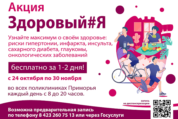 Проверить бесплатно и в удобное время состояние своего организма до конца осени может каждый житель Приморья. Сегодня, 24 октября, в государственных медицинских учреждениях края стартовала акция «Здоровый#Я». Она направлена на выявление рисков возникновения онкологических и сердечно-сосудистых заболеваний. Пройти обследование можно ежедневно в любой поликлинике с раннего утра до позднего вечера. По результатам врачи дадут индивидуальные консультации о сохранении здоровья. Акция продлится до 30 ноября, сообщает портал VladMedicina.ru.