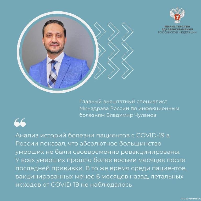 — Анализ историй болезни пациентов с COVID-19 в России показал, что абсолютное большинство умерших не были своевременно ревакцинированы. У всех умерших прошло более восьми месяцев после последней прививки. В то же время среди пациентов, вакцинированных менее 6 месяцев назад, летальных исходов от COVID-19 не наблюдалось, — сказал Владимир Чуланов.
